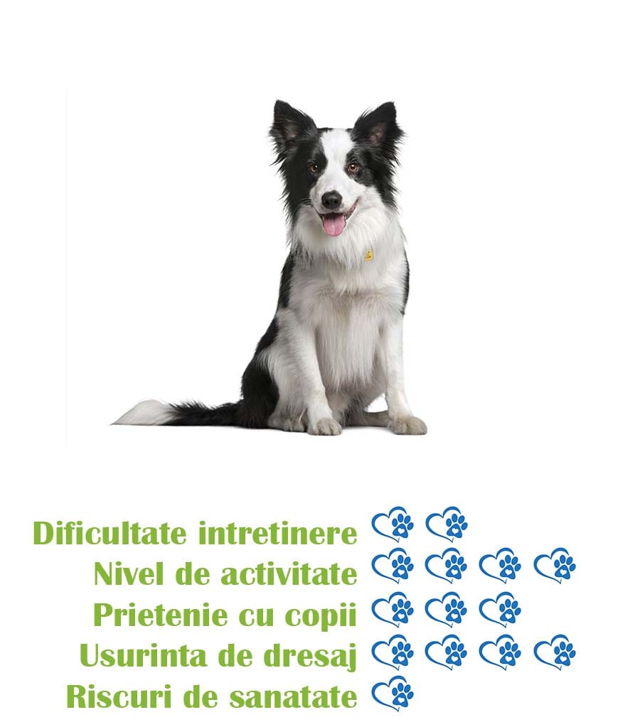 - Energie: Border Collie are nevoie de multa activitate fizica si mentala, fiind ideal pentru cei care iubesc activitatile in aer liber sau sporturile cu cainii.