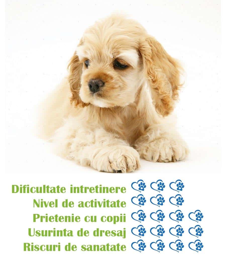 - Aptitudini de antrenament: Cocker Spaniel American este o rasa inteligenta si usor de antrenat, fiind potrivita pentru dresaj si concursuri de obediență sau agility
