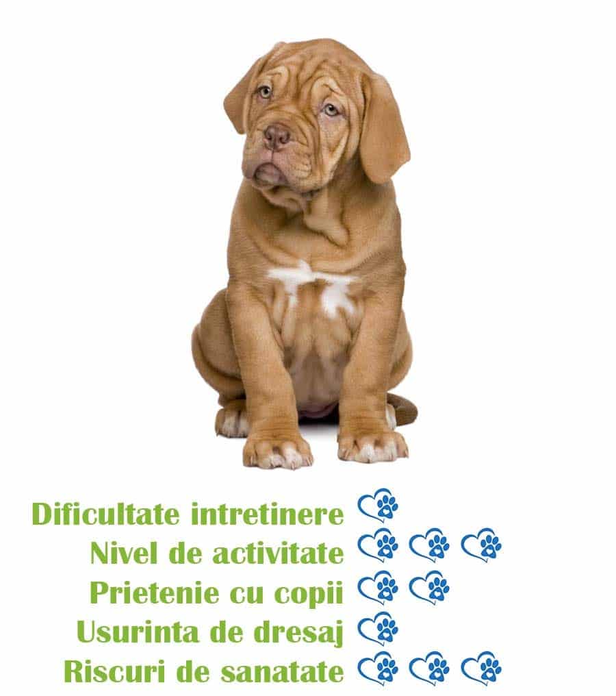 - Aptitudini de antrenament: Dog de Bordeaux este o rasa inteligenta si usor de antrenat, fiind potrivit pentru dresaj si activitati sportive precum agility si obedience.