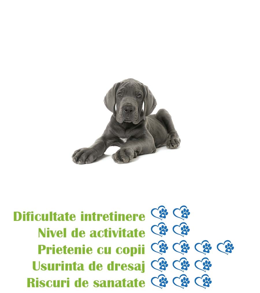 - Inteligenta: Dog German este o rasa inteligenta si usor de antrenat, fiind potrivit pentru cei care doresc un companion bine educat.