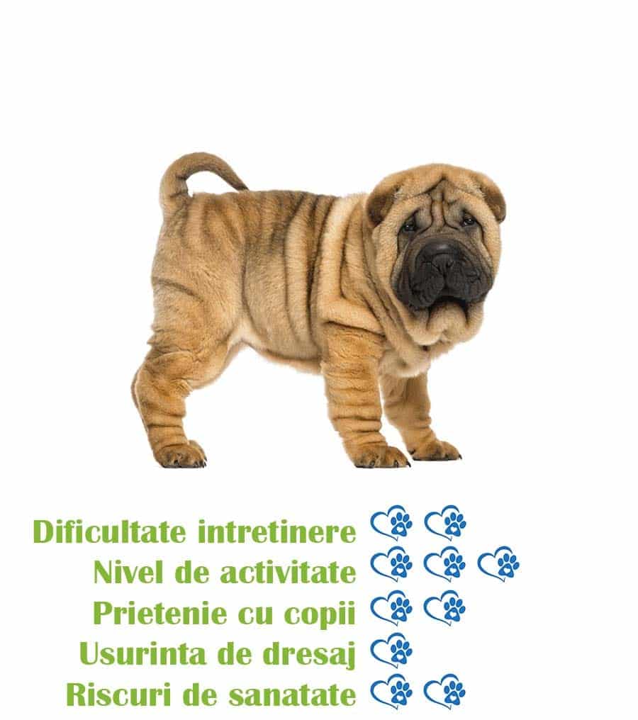 - Aparitia unica: Shar Pei este o rasa cu o blana neteda si un aspect unic, cu pliuri si cute in jurul fetei si al corpului.