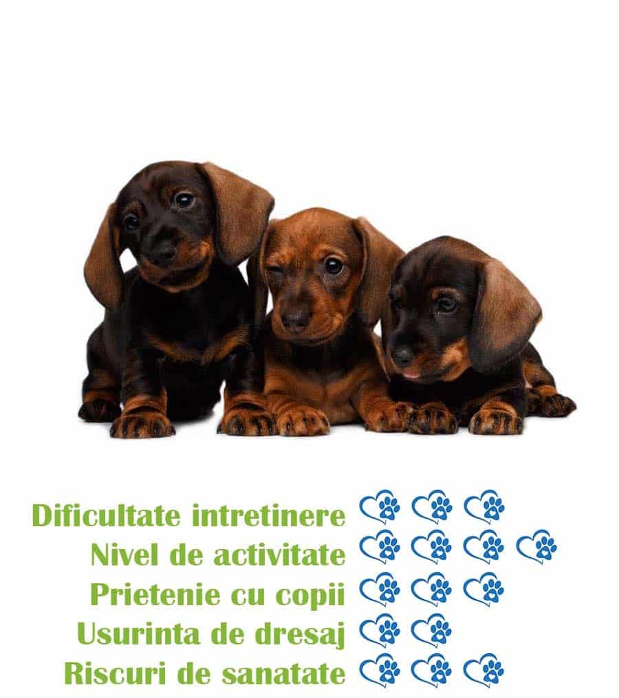 - Marimea: Teckel-ul este o rasa de caine mica, fiind perfect pentru cei care au spatii limitate sau pentru cei care cauta un companion de apartament.