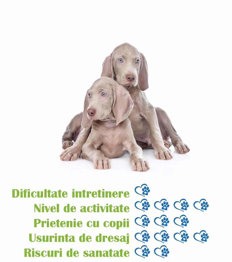 - Aptitudini sportive: Weimaraner este o rasa energica, care se bucura de activitati precum alergatul, inotul sau jocurile de aducerea mingii